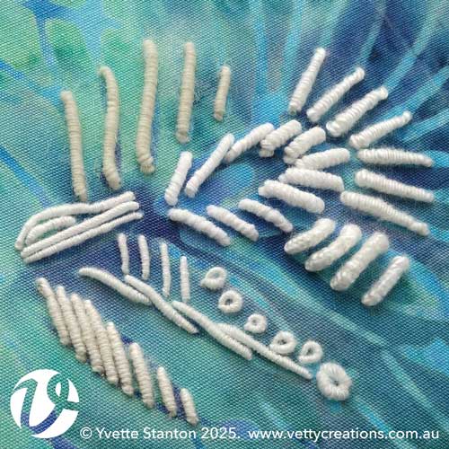 I found the class very uplifting. Whilst I had been working on Mountmellick stitches, samples etc. for a couple of months prior to the class, it took the class to really get me into the "swing" of things. Yvette had time for everyone, at our own speed of working, and there was always an encouraging word for everyone's work, even if later she made a very discreet suggestion to try some other way for doing a stitch. The confidence I gained at this course was wonderful, as I now find that I am willing to try just about any surface stitch. I can also see where learning these stitches will take me further with surface stitchery in the future -- the use of different threads and stitches which can be used to give different effects. Thanks Yvette. --Heather
