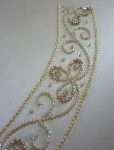 I’ve nearly finished the beading on the bodice of my dress. Just a bit more chain stitch and some sequins to add. I’m very pleased with how it is going. I am using the French embroidery beading technique as shown in Maisie Jarratt’s book “French Embroidery Beading: How To Bead”.