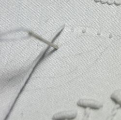 Something to take note of: As No 3 Mountmellick thread has 6 ply, it can become very obvious when the amount of twist changes from stitch to stitch. Try to keep the thread evenly twisted throughout the stitching. If this means that you have to manually retwist the thread before taking each stitch, then do it! If it means untwisting it a little, then do that! You are the mistress/master of the thread, so make it do what you want it to!