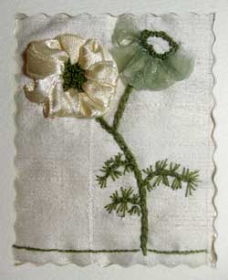 It features two very pretty ribbon flowers (daisies?) with a whipped chain stitch stem, and the prettiest little feathery leaves! Its on beautiful ivory silk dupion. The flowers are of satin ribbon and organza ribbon. The centres have massed French knots and a ring of French knots.