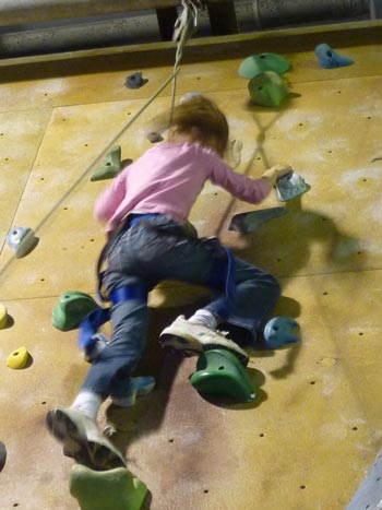 Rainbow Girl took a little while to warm to the idea of rock climbing. On her first – very beginner – climb, she burst into tears and wanted to come down. The Bookworm, however, lapped it up and really enjoyed herself. She did lots of climbs, all the way up to the ceiling.