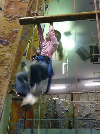 rock climbingShe also climbed up a very large “ladder” where the rungs were about the height of an adult apart from each other. They were also about that wide. So it really involved hoisting yourself up on one rope, hooking any part of your body over the next rung and pulling yourself up.