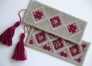 The bookmarks are worked on natural 28 count linen, with pretty variegated pearl cottons and stranded floss. They are constructed by hand, so a sewing machine is not needed to finish your bookmark.