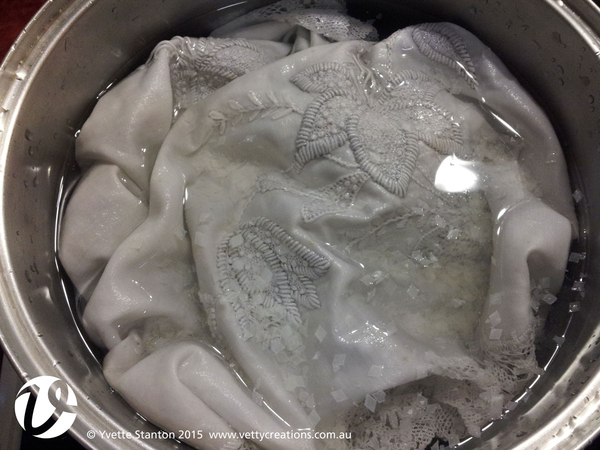 This morning I finally got the chance to do The Big Boil Up. By the time I got to it, the embroidery had been soaking in cold water for about 36 hours.