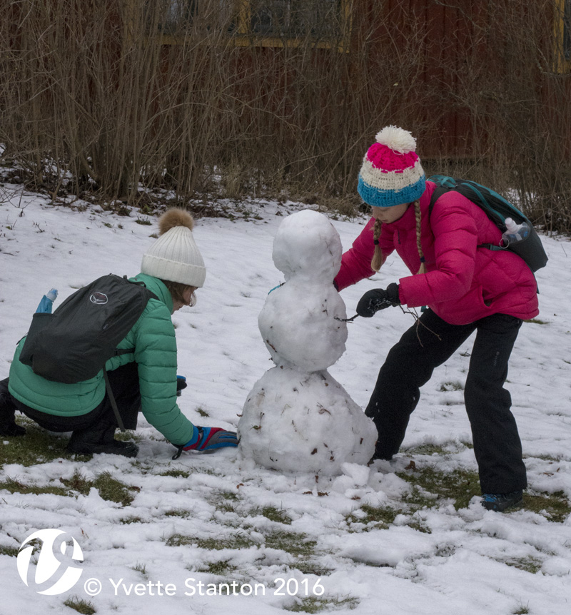 Making a snowman with very little snow. It had snowed the night before – probably the first of the season.
