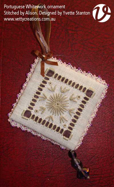 I also received an email from one of the Morpeth class participants, who has already finished her Portuguese Whitework ornament! Alison did a lovely job of stitching and finishing the ornament, and really enjoyed the technique. She’s looking forward to stitching more from the book. Congratulations Alison!