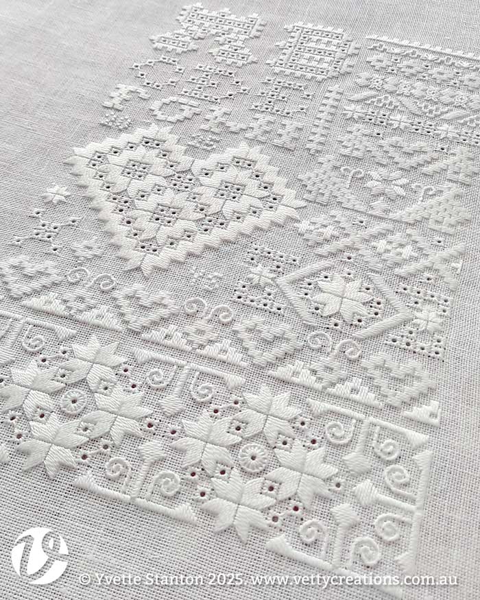 Learn the technique of Frisian whitework with this beautiful sampler at a weekend workshop in Walcha, NSW (Australia), with the Whitework Queen herself, Yvette Stanton.